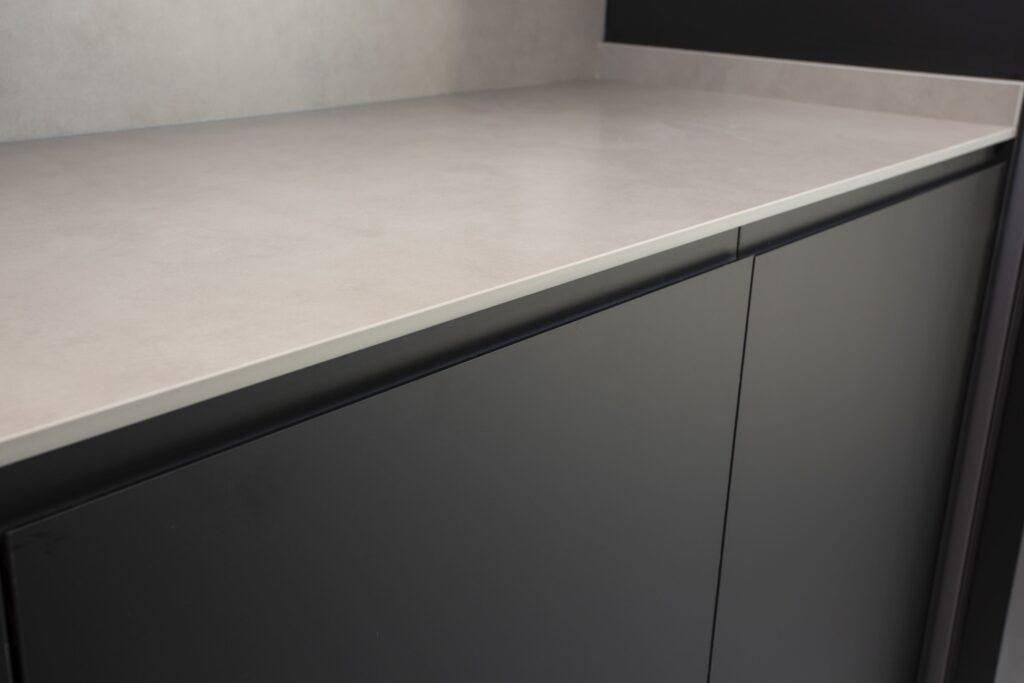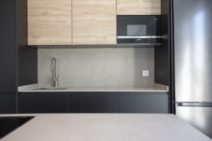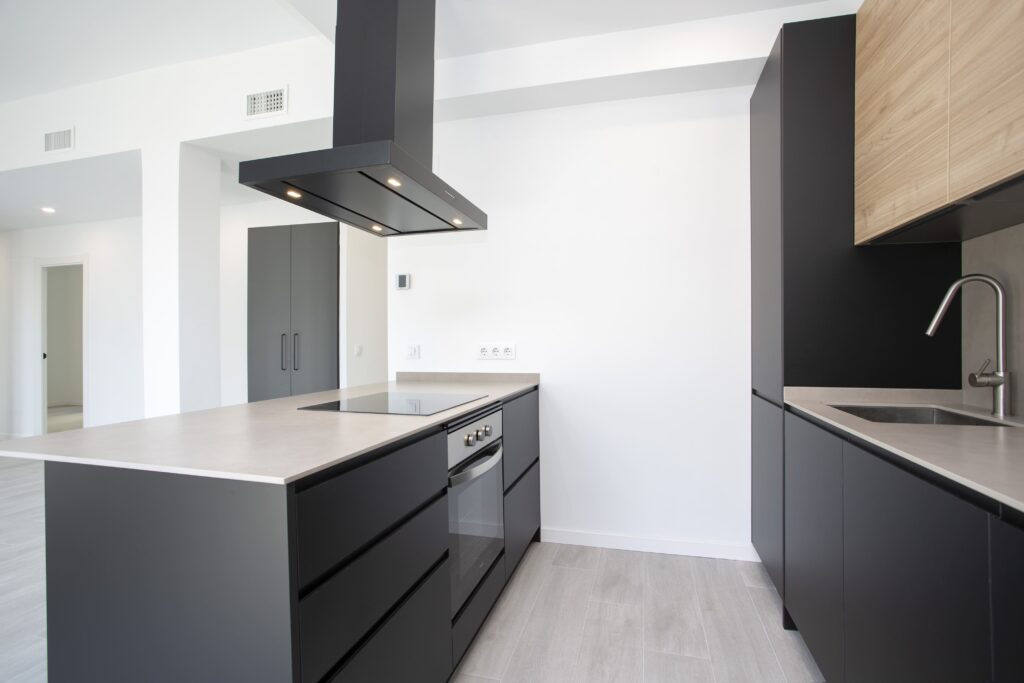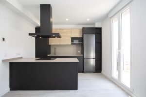 En cuanto al diseño, trabajamos con una paleta de tonos neutros, pensada para atraer a un perfil amplio de usuarios y facilitar la comercialización del inmueble. La cocina en acabado negro aporta un punto de carácter y contraste, elevando el nivel estético del conjunto sin perder sobriedad.